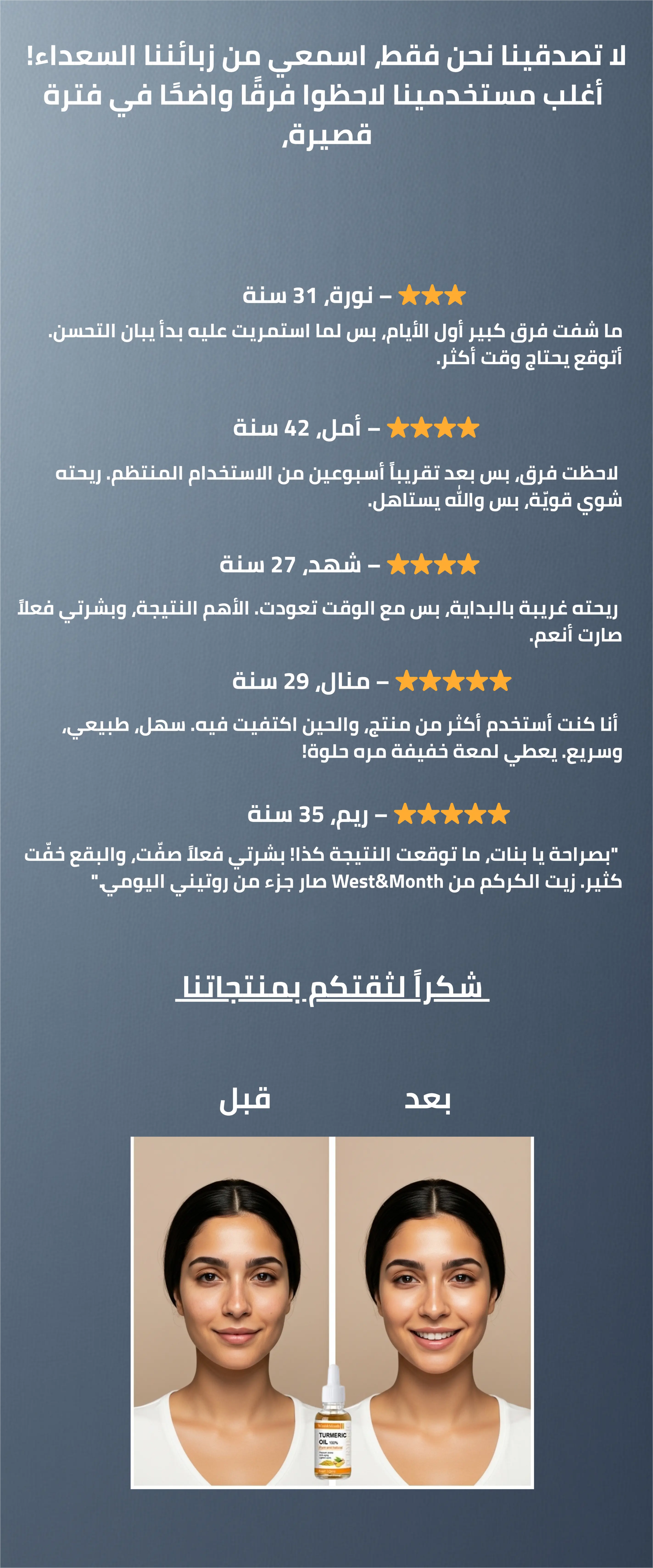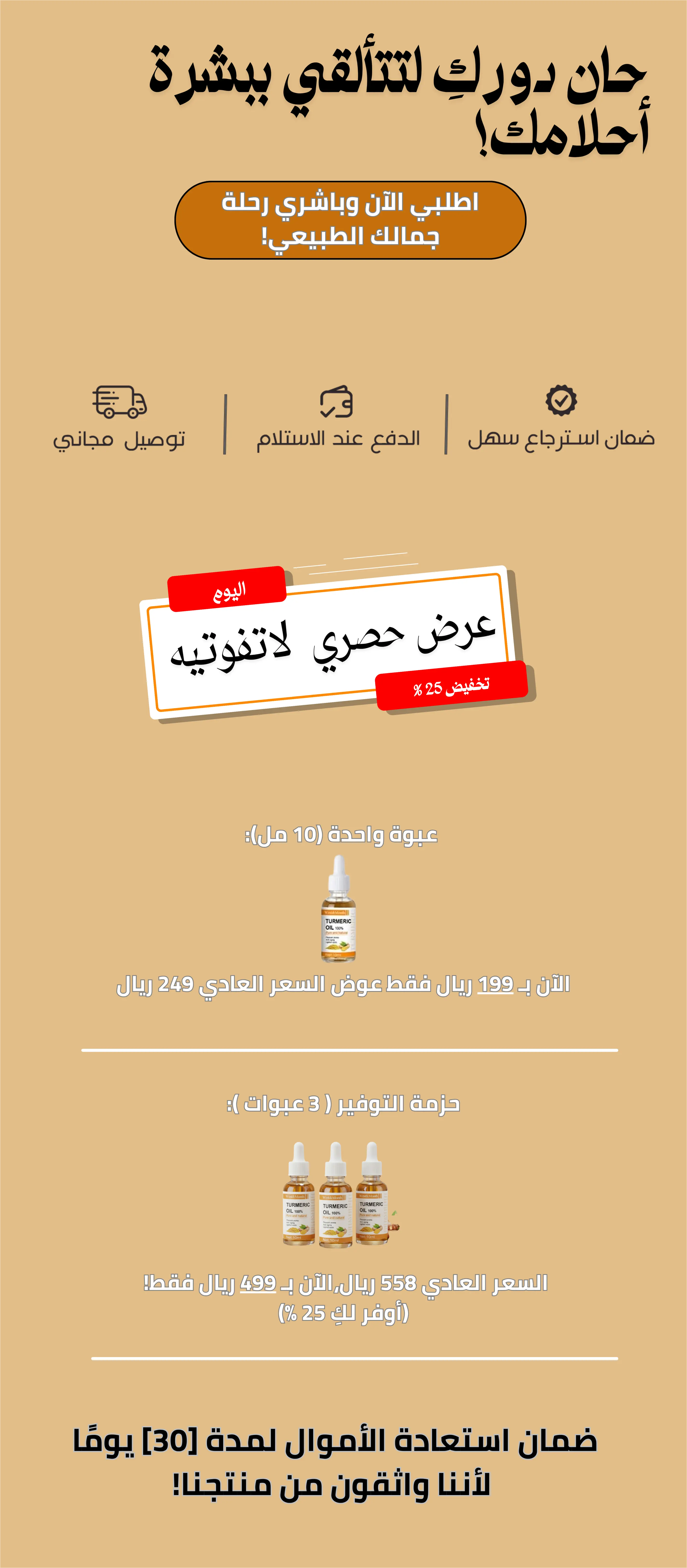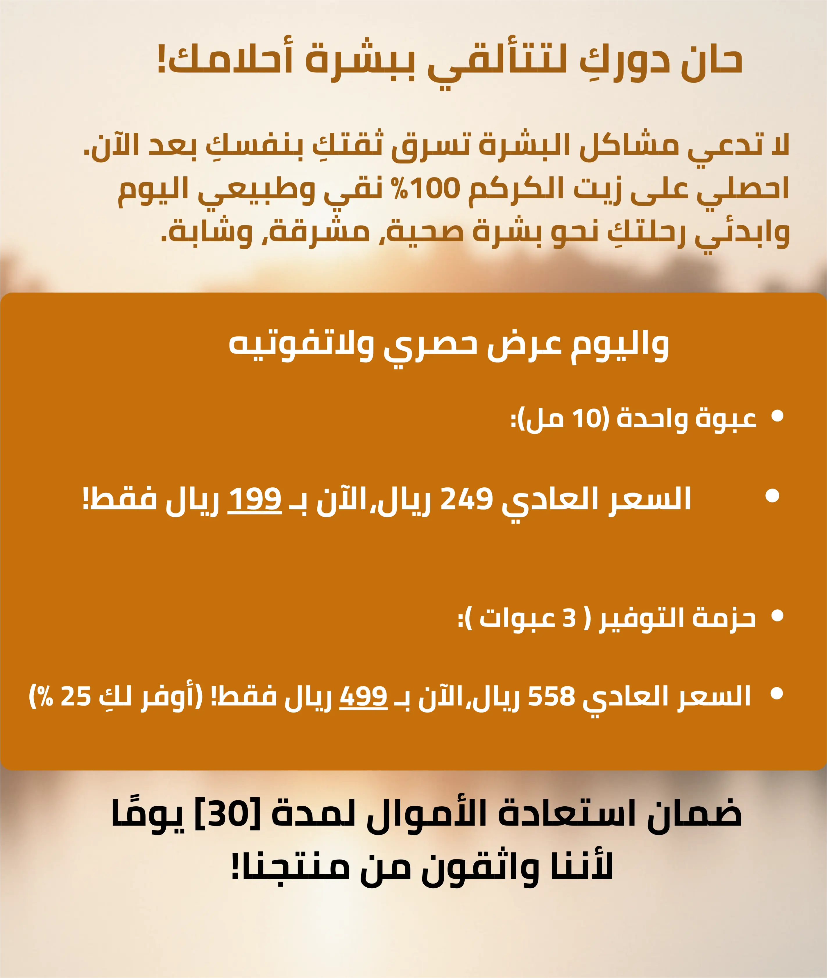 اطلبي زيت الكركم الطبيعي 100% الآن وتمتعي بإشراقة صحية وجميلة.